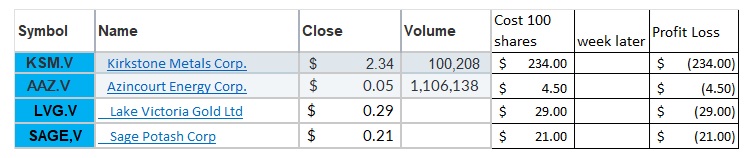 Lake Victoria Gold Corp. (LVG) They have a very promising project in Tanzania. They have very high gram /ton Gold assays on recent drilling. I bought them this week as well.